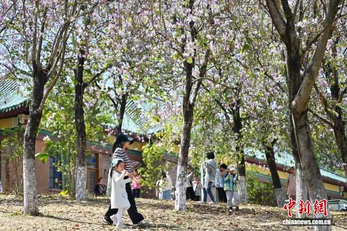 3月14日,位于广州市银河区的华北农业年夜教宫粉紫荆衰搁,吸收游人赏花摄影。中新社记者 旧楚白 摄